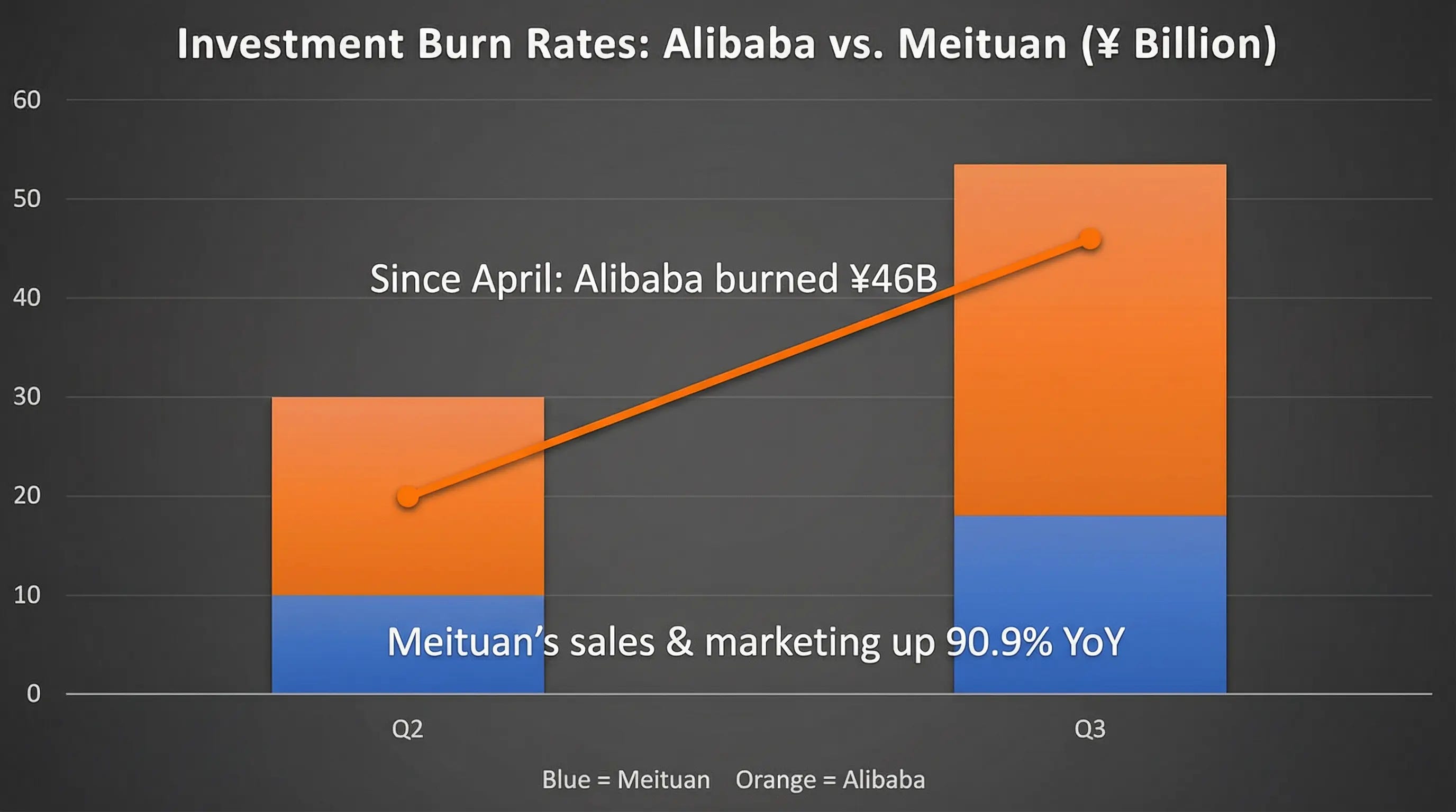 The redistribution carried a heavy financial cost. Alibaba burned ¥35–36 billion ($4.8–5 billion) in Q3 on instant retail subsidies. Since the launch of Taobao Shangou in late April, cumulative losses exceeded ¥46 billion ($6.4 billion). Meituan spent ¥15–20 billion ($2.1–2.8 billion) in Q3 to defend its position. Its sales and marketing expenses rose 90.9 percent year over year to ¥34.3 billion ($4.7 billion).