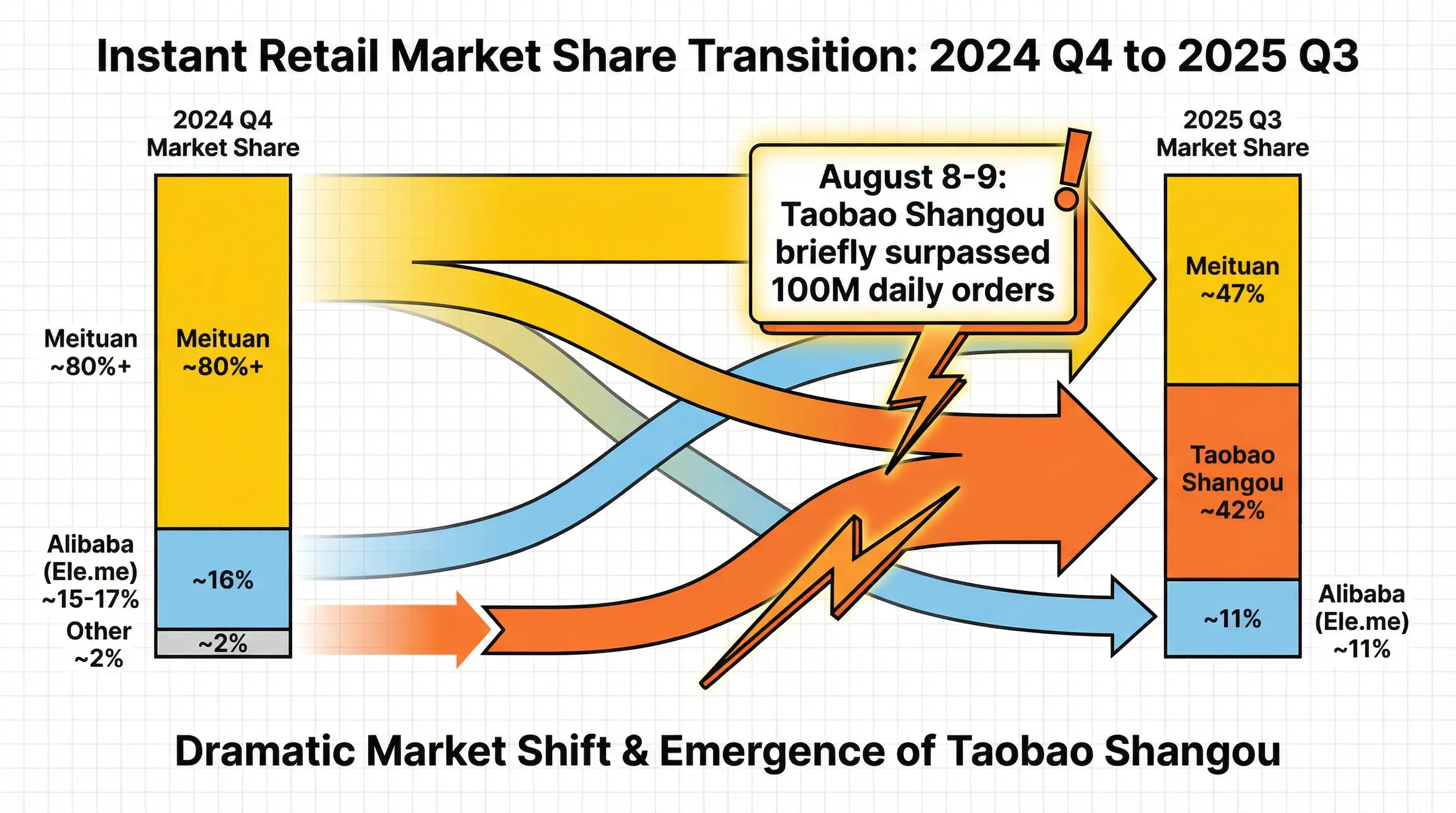 Six months earlier, Meituan dominated the category and controlled more than 80 percent of food delivery orders in China. By Q3 2025, that dominance had weakened. Several data sources place Meituan near 47 percent share and Taobao Shangou near 42 percent. On August 8 and 9, Taobao Shangou briefly surpassed Meituan and exceeded 100 million daily orders.