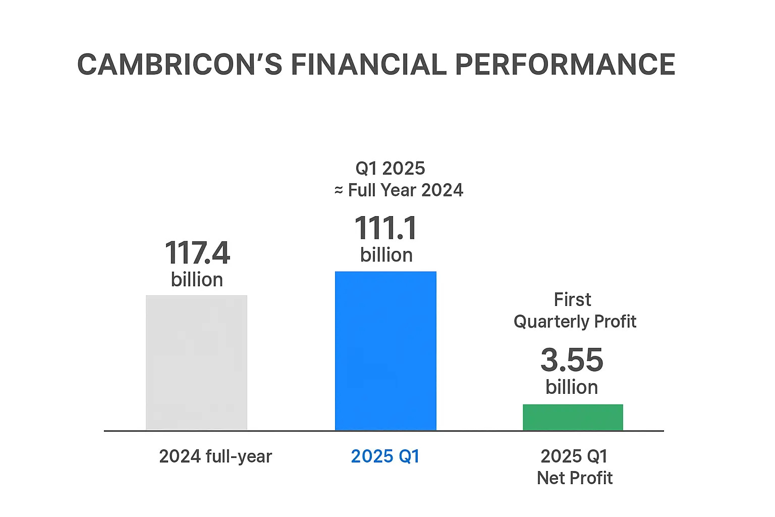 The numbers behind Cambricon’s meteoric rise tell a story of dramatic business transformation that few saw coming. In Q1 2025, the company reported revenue of 11.11 billion RMB ($1.5 billion)–a staggering 4,230% increase compared to the same period last year. More significantly, this quarterly revenue nearly matched Cambricon’s entire 2024 annual revenue of 11.74 billion RMB ($1.6 billion). For a company that lost a cumulative 5.4 billion RMB ($750 million) over eight years of operation, achieving 3.55 billion RMB ($490 million) in net profit in a single quarter represents nothing short of a business miracle.