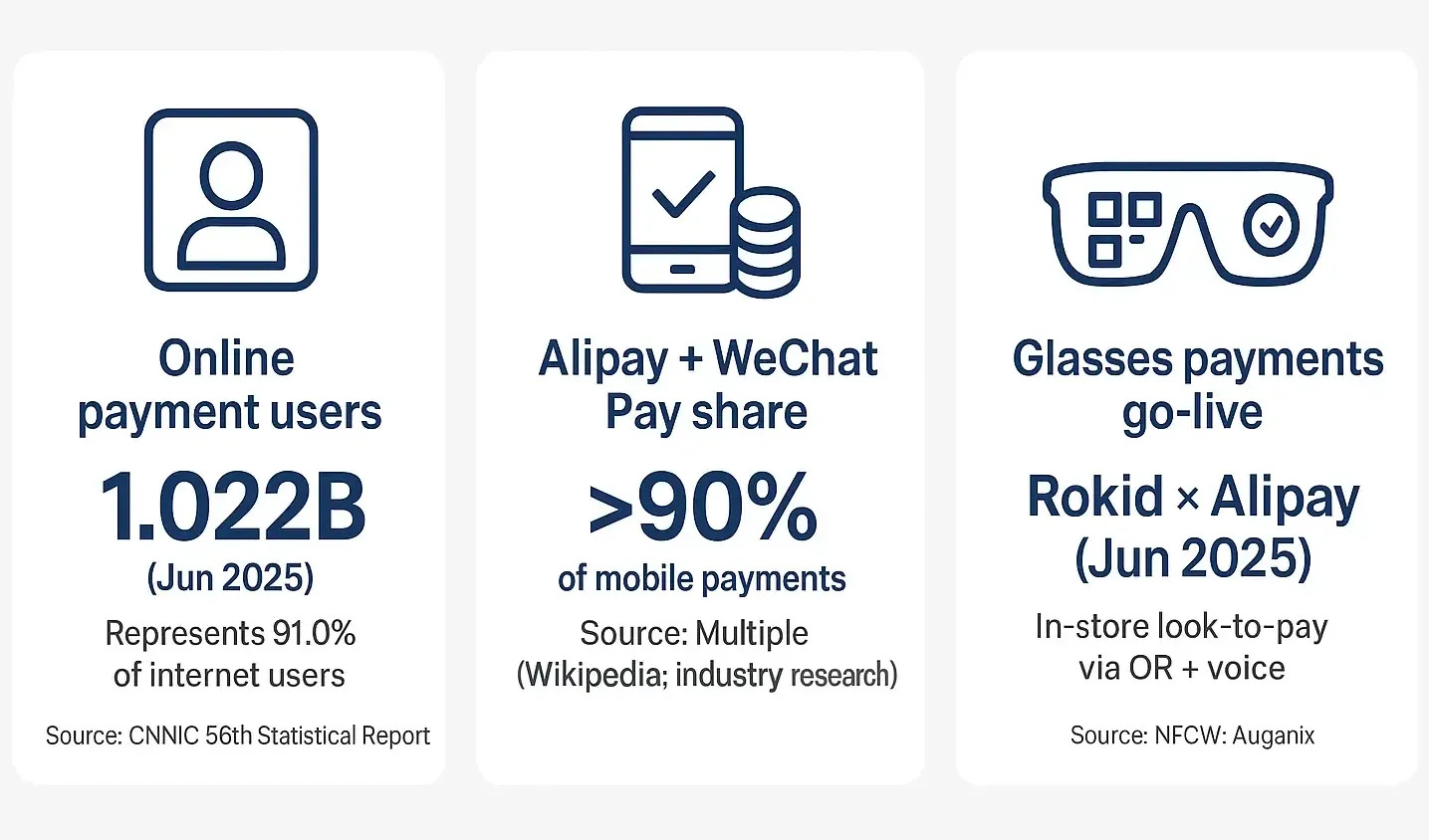 The sudden viability of AI glasses in China is not the story of a product breakthrough. It isn’t about superior optics, lighter frames, or even more intelligent AI. The real story is one of strategic inheritance. China’s tech players have stumbled upon a killer app that doesn’t require building a new ecosystem from scratch, because the foundation for it was laid a decade ago. That foundation is the country’s ubiquitous QR‑code mobile payments infrastructure (see updated: CNNIC 56th report, June 2025: 1.022B online payment users, 91.0%).