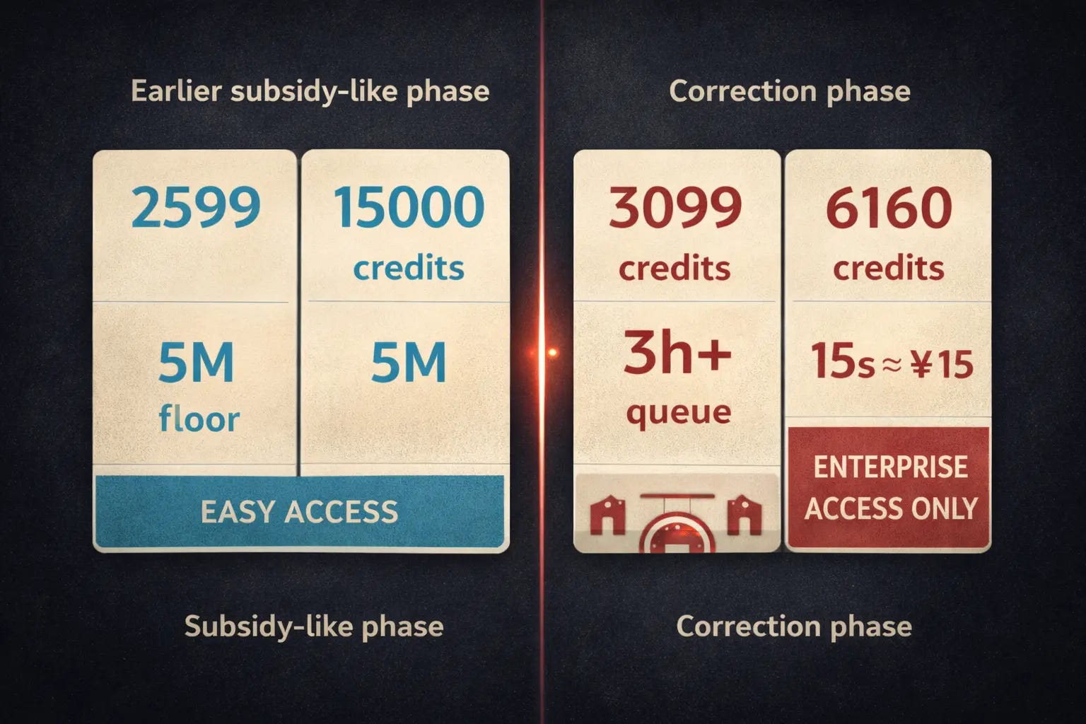 Rather than consolidating its lead through ecosystem expansion, Bytedance raised prices. Repeatedly. Within a single month of Sora’s shutdown, Jimeng, Bytedance’s consumer-facing AI creation platform, implemented at least three price increases. The premium tier’s annual subscription jumped from Rmb 2,599 to Rmb 3,099. Monthly credit allocations were cut by a third to more than half, depending on the subscription level. The cost of generating raw materials for a 2-minute AI comic drama climbed from roughly Rmb 7 to Rmb 80. Access to Seedance 2.0’s realistic human video mode required a separate enterprise agreement with a Rmb 5 million ($690,000) spending floor.