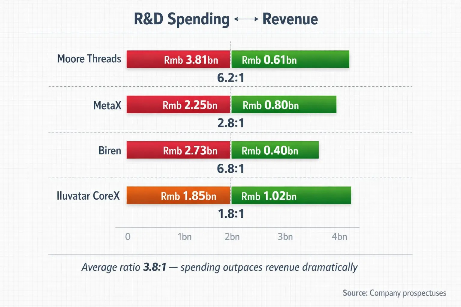 Consider the cash burn. Across 2022–2024, the quartet poured Rmb10.63bn into R&D while generating just Rmb2.82bn in cumulative revenue. Moore Threads alone spent Rmb1.36bn on development last year against sales of Rmb438m–a ratio exceeding 300%. Iluvatar burned through Rmb1.85bn in R&D over three years while booking Rmb1.02bn in revenue. Losses over three years total Rmb15.02bn, with Moore Threads accounting for Rmb5bn, MetaX for Rmb3.06bn, Biren for Rmb4.76bn, and Iluvatar for Rmb2.26bn. First-half 2025 figures show scant improvement: Biren burned Rmb1.6bn while booking just Rmb59m in revenue; Iluvatar lost Rmb609m against Rmb324m in sales.