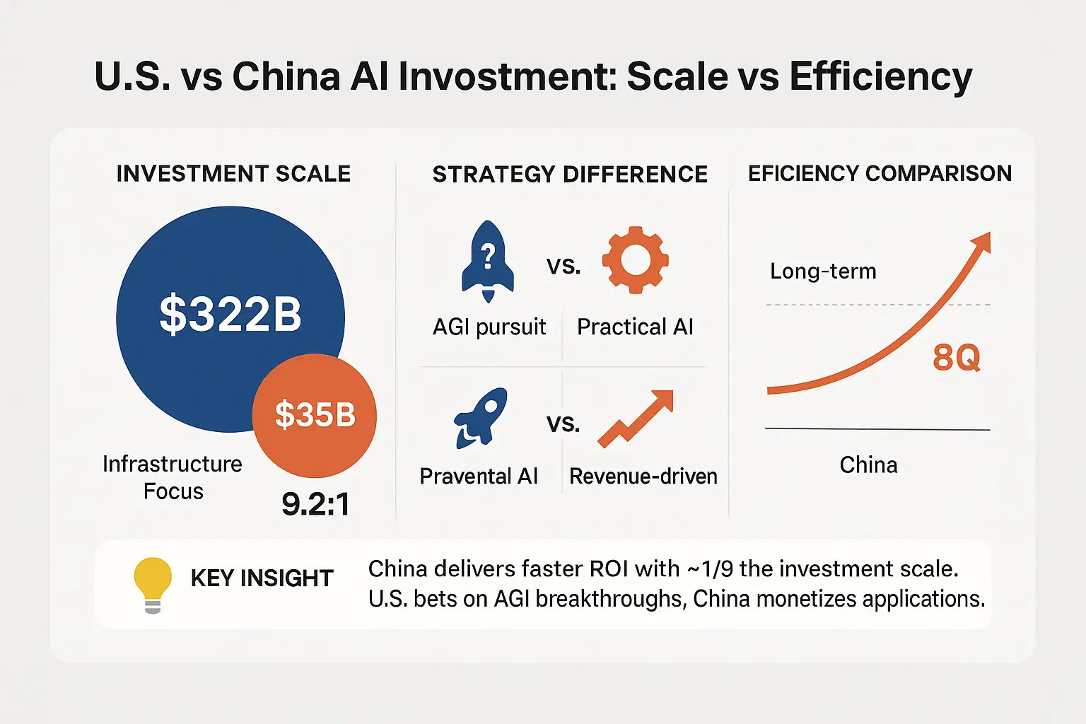 The numbers illustrate starkly different approaches to AI development. U.S. tech companies are expected to spend $280–$364 billion in 2025 on AI infrastructure, supporting what amounts to a speculative bet on future AGI returns. Chinese companies, constrained partly by semiconductor restrictions, are focusing on smaller language models that deliver immediate applications.