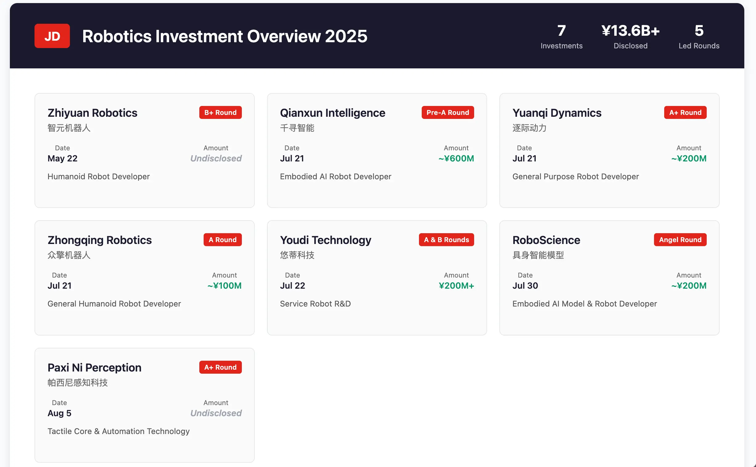 JD’s robotics investment spree this year tells a story that most observers are missing. Since May, the e-commerce giant has completed six robotics deals, including leading rounds for companies like Paxini Robotics and committing over $1 billion in resources through their “Intelligent Robot Industry Acceleration Plan.” On the surface, this looks like confidence. Dig deeper, and you’ll find something more urgent: JD is actually the latecomer desperately trying to catch up.