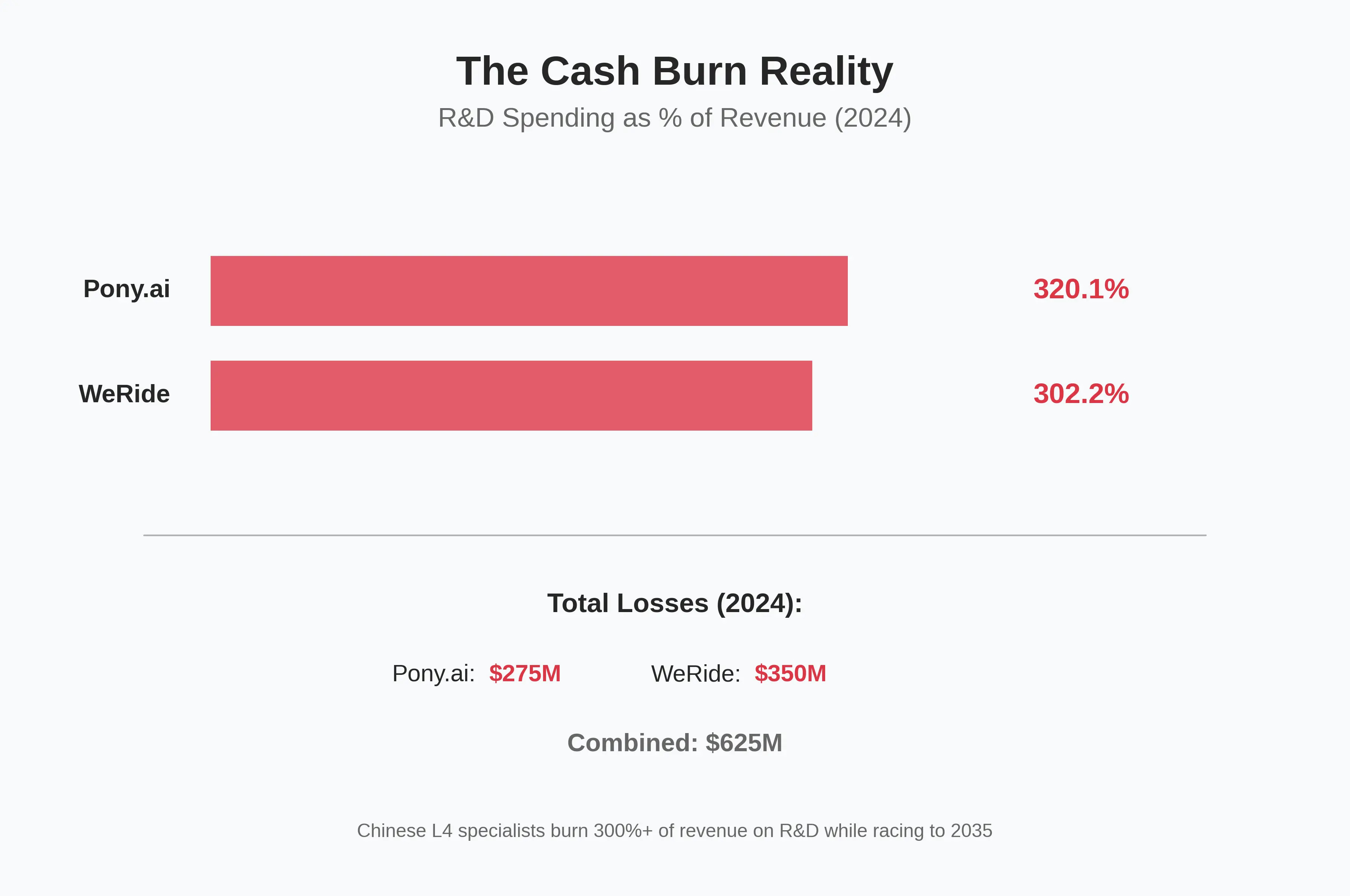 The market has looked under the hood. The financials are alarming. This is not a business; it is a science experiment funded by capital markets. Both companies concede they are in the “early stages of commercialization”. The cash burn is startling. In 2024, Pony.ai’s R&D spend was an astonishing 320.1% of its revenue. WeRide’s was 302.2%. Pony.ai’s losses hit $275 million in 2024, while WeRide’s topped $350 million.