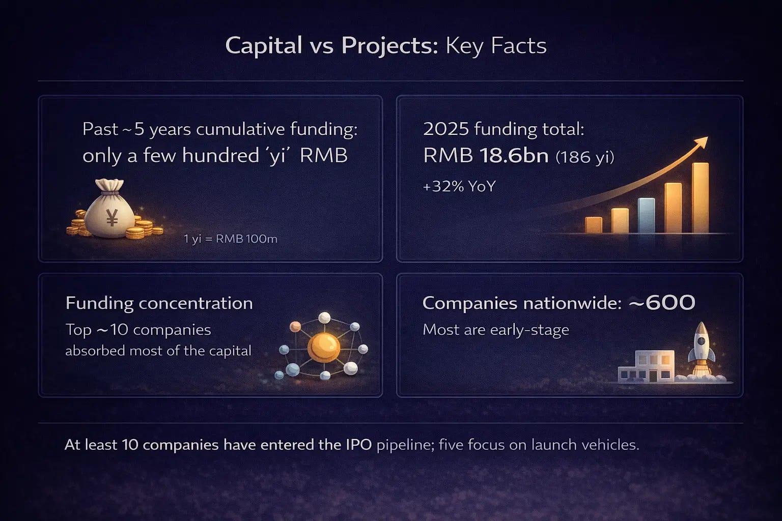 Now capital is arriving faster than companies can absorb it. Multiple local government funds are setting up dedicated vehicles for commercial space. But the total number of viable companies in China remains small, around 600, with most still in early development stages. Investors openly acknowledge that good projects are scarce.