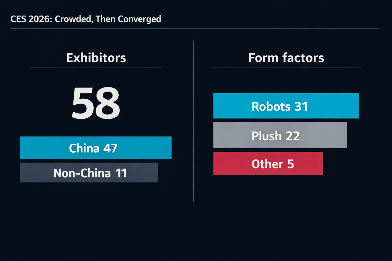 At CES 2026 in Las Vegas this January, the AI toy section told a story in two acts. In the first, nearly 50 Chinese companies unveiled conversational stuffed animals, desktop robot pets, and AI-powered figurines. They outnumbered non-Chinese exhibitors in the category by four to one. In the second, quieter act, visitors walking the booths noticed something else. Most of the products were hard to tell apart. Of the 58 AI toy and companion-robot companies on display, 31 were robot variants and 22 were plush variants. The form factors had converged. The underlying technology had converged, too.