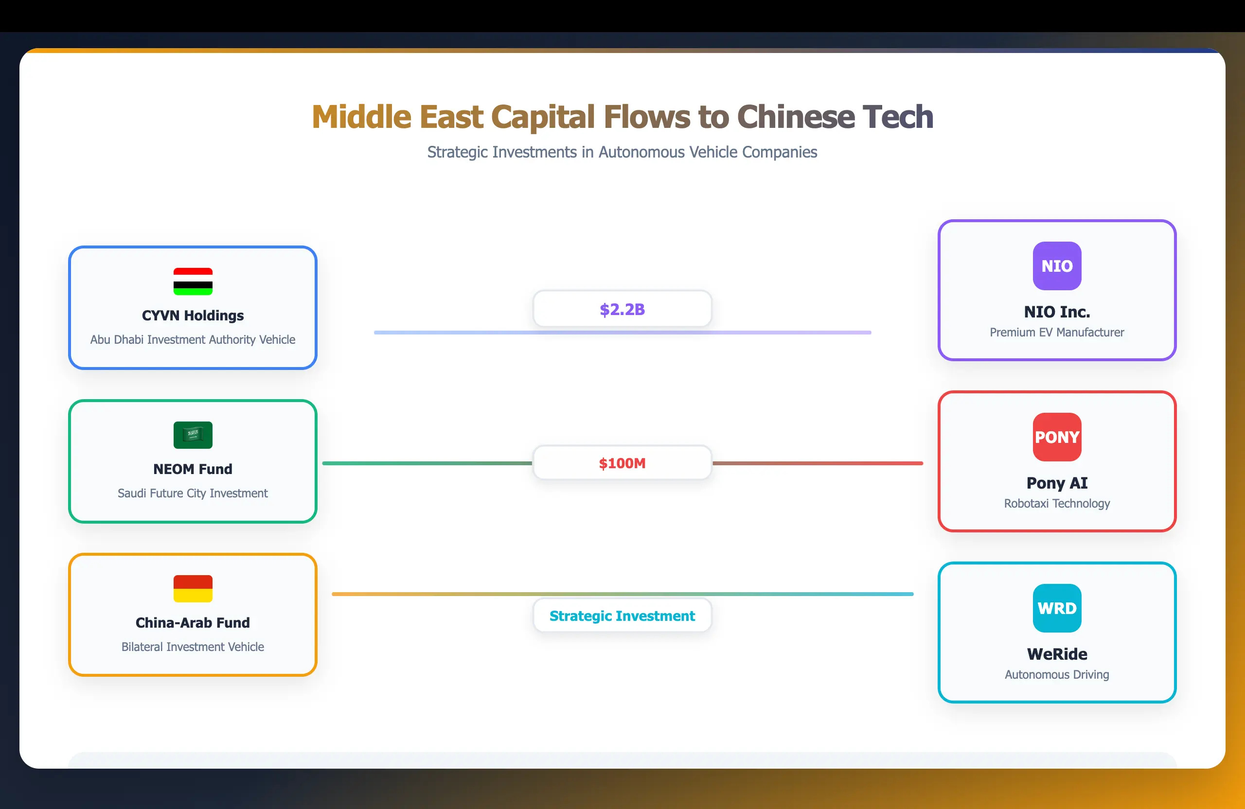 But the financial relationship runs deeper than just market opportunity. Middle Eastern sovereign wealth funds have become crucial investors in Chinese autonomous vehicle companies. Abu Dhabi government-controlled CYVN invested $2.2 billion in NIO in 2023, while Saudi Arabia’s NEOM fund put $100 million into Pony AI. These aren’t passive investments—they’re strategic partnerships that facilitate market access.