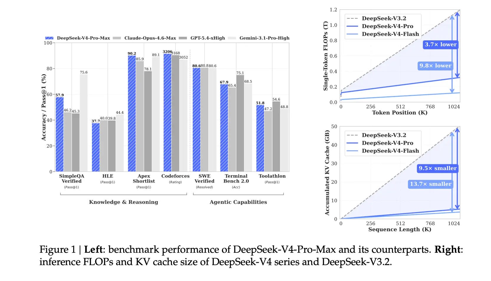The surface story is straightforward. DeepSeek has released a new model family with a one-million-token context window. In its V4 technical report, the company says V4-Pro uses only 27% of the single-token inference FLOPs and 10% of the KV cache of DeepSeek-V3.2 in a one-million-token context setting. V4-Flash goes further, at 10% of the FLOPs and 7% of the KV cache.