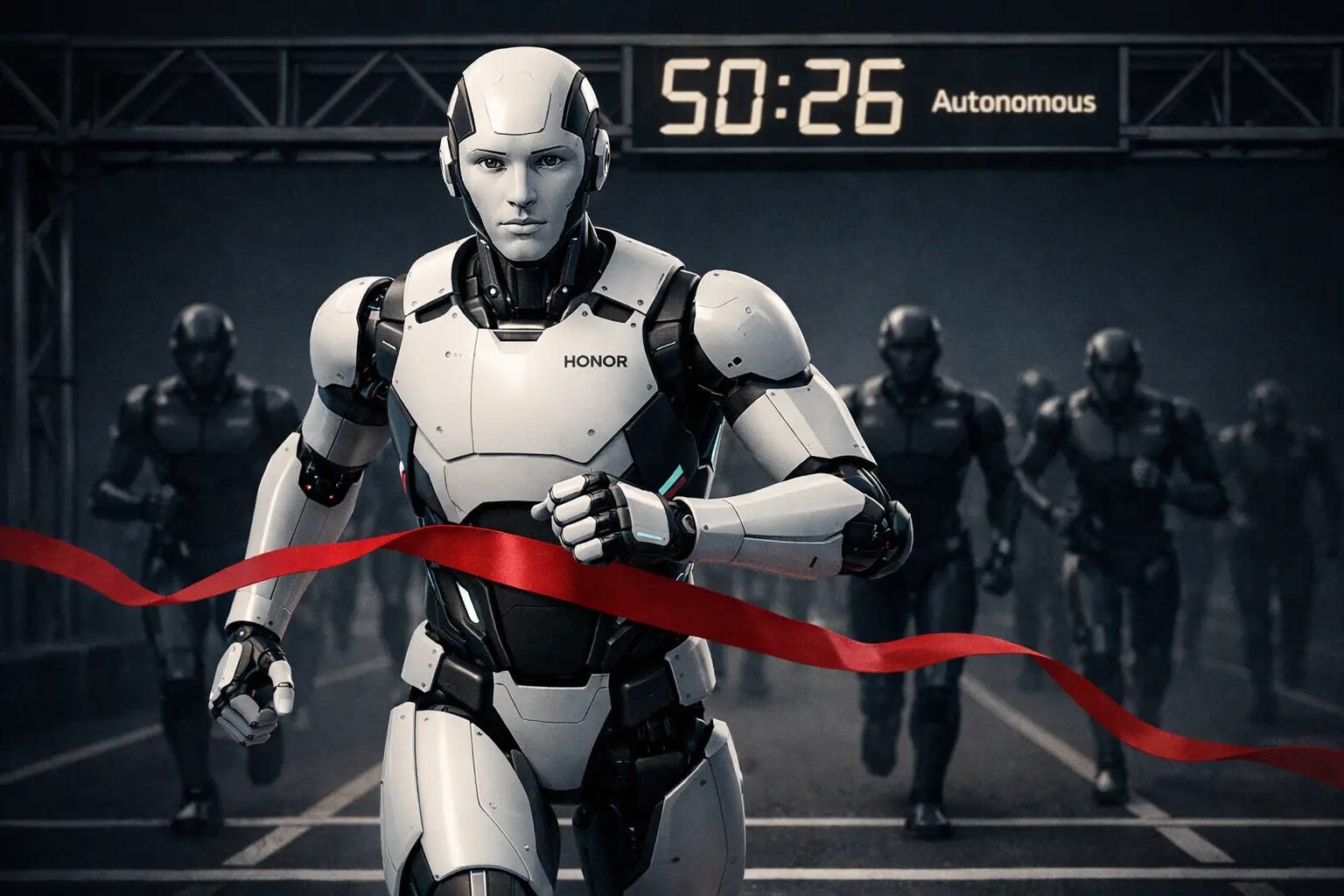 On April 19, a humanoid robot built by Honor, the smartphone brand spun out of Huawei, crossed the finish line of the Beijing E-Town Half Marathon in 50 minutes and 26 seconds. The time beat the human world record. It finished ahead of every pure-play robotics entrant on the course.