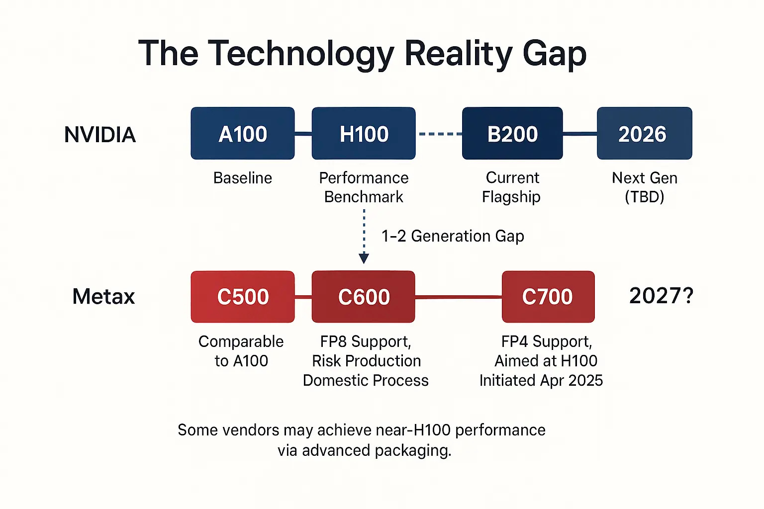 The Shanghai Stock Exchange clearly pressed Metax for specific performance benchmarks, and the company’s responses are revealing. Their flagship C500 series chips benchmark against NVIDIA’s A100–a product released in 2020. Their upcoming C700 series targets H100 performance, representing technology NVIDIA shipped in 2022. This isn’t catching up; it’s maintaining a predictable 2–3 year technological lag.