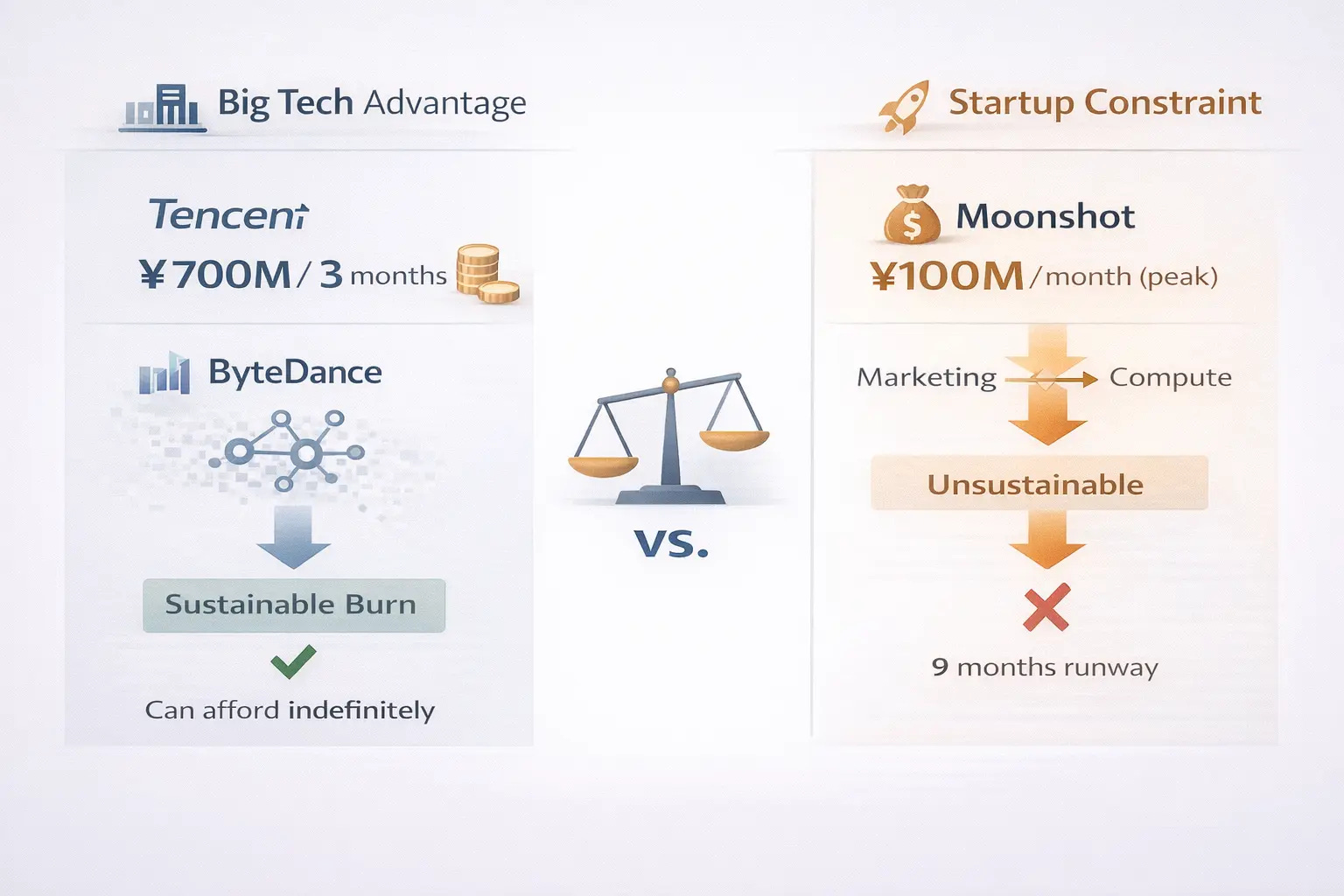 Big Tech wins traffic acquisition because they own distribution and can sustain infinite burn. Startups lose because they’re renting both the distribution and the compute. The capital requirements compound. Every yuan spent on user acquisition is a yuan not spent on model training. Every iteration cycle forced by competition drains reserves that marketing campaigns already depleted.