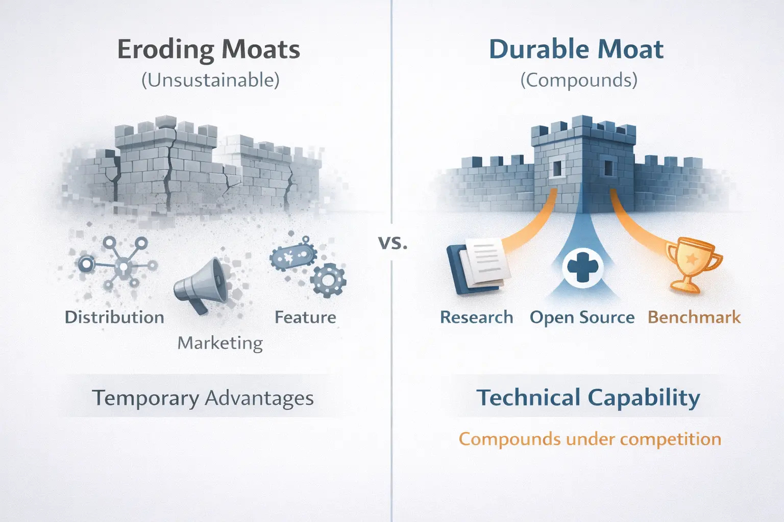 First, technical capability is becoming the scarcest moat under China’s competitive dynamics.Distribution advantages erode when platforms weaponize access. Marketing spend creates temporary spikes that don’t compound. Even large language model capabilities commoditize over time as open-source alternatives improve. But sustained investment in frontier research creates differentiation that’s harder for competitors to replicate at equivalent cost.