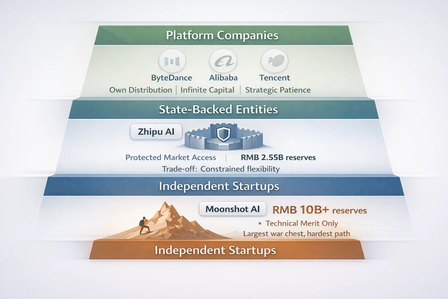 My October 2025 analysis I wrote on Zhipu’s transformation showed one escape route: find a protected market niche where political alignment matters more than pure technical competition. Zhipu pivoted to state-backed AI services, leveraging privileged access to government contracts that value institutional trust as much as capability. This creates a genuine moat in China’s political economy.