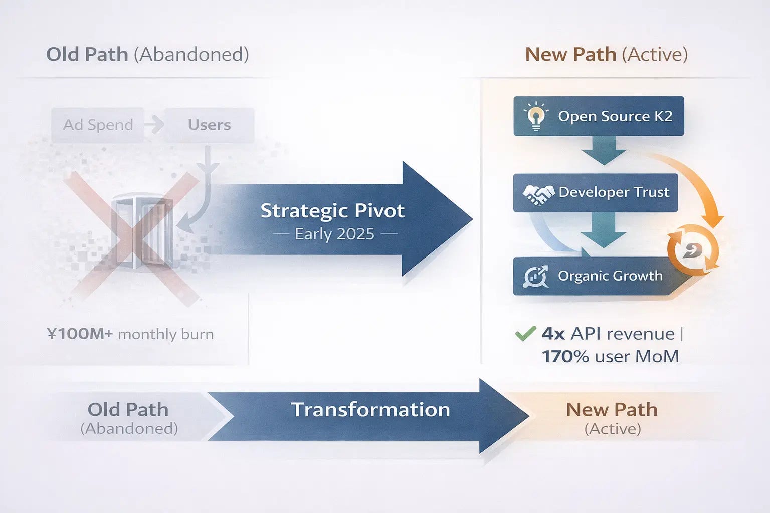 Moonshot’s leadership saw this pattern forming in early 2025. The insight was simpler than it sounds: you can’t win a traffic war and a compute war simultaneously.