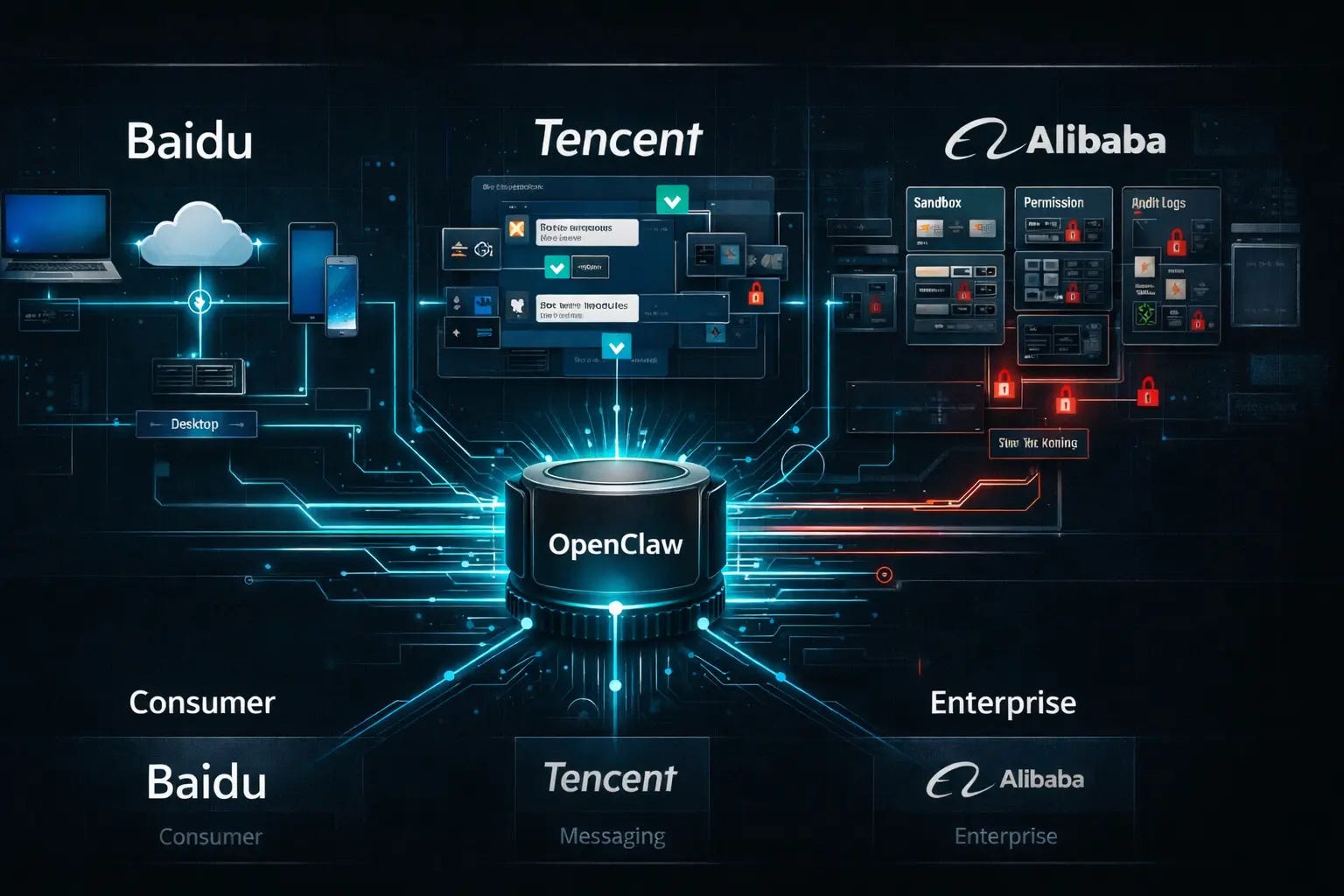 The shared initial impulse was to lower every barrier and get agents running as quickly as possible. But the divergence came fast. Baidu leaned toward consumer-facing saturation, releasing what Chinese media called the “lobster family bucket” (a play on OpenClaw’s lobster mascot): agent products spanning desktop, cloud, mobile, and smart home, all wired into Baidu’s model and search capabilities. Tencent moved to lock down messaging entry points under a risk-controlled framework, launching three agent products on a single day that covered personal WeChat, enterprise chat, and WeChat Work bots. Alibaba bypassed the consumer scramble entirely, launching Wukong, an enterprise agent platform built on DingTalk with sandboxed execution, permission controls, and full audit logging. As one analysis put it, China’s big tech went from carnival to divergence within weeks.