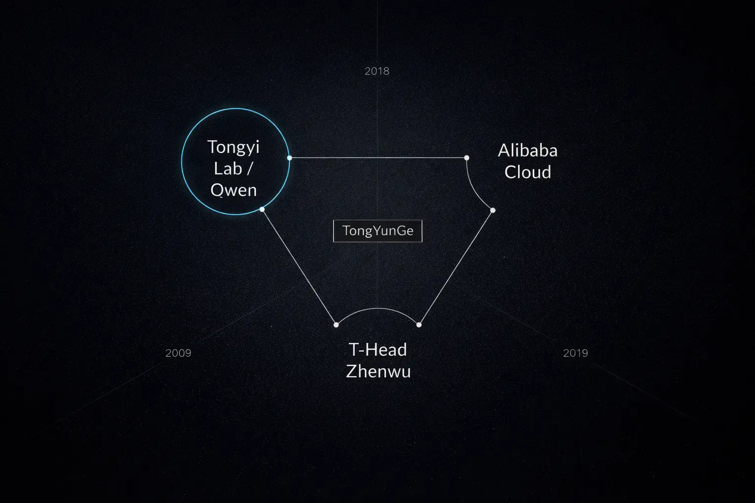 The reason is a three-character phrase: “TongYunGe(通云哥).” Ma reportedly coined the term internally in spring 2025, but it only surfaced publicly in recent weeks. A name in his trademark wuxia style for an architecture seventeen years in the making, from Alibaba Cloud’s founding in 2009 to Pingtougei’s creation in 2018 to the launch of large model research in 2019. It binds Tongyi Lab, Alibaba Cloud, and Pingtougei (Alibaba’s chip subsidiary) into the vertically integrated stack I analyzed in February: model as customer acquisition funnel, cloud as margin center, self-developed Zhenwu chips as the hardware floor. Only Google runs a comparable full-stack architecture. The reorganization serves TongYunGe, not Qwen.