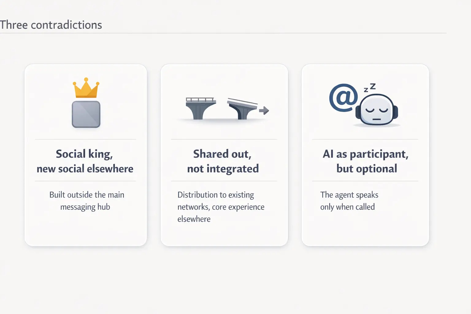 The deeper reason is structural. WeChat is a moat that is so deep that Tencent cannot casually add new moving parts into it. When a product becomes a country’s default communication layer, every change becomes a high-risk procedure. The upside is uncertain. The downside is very legible.