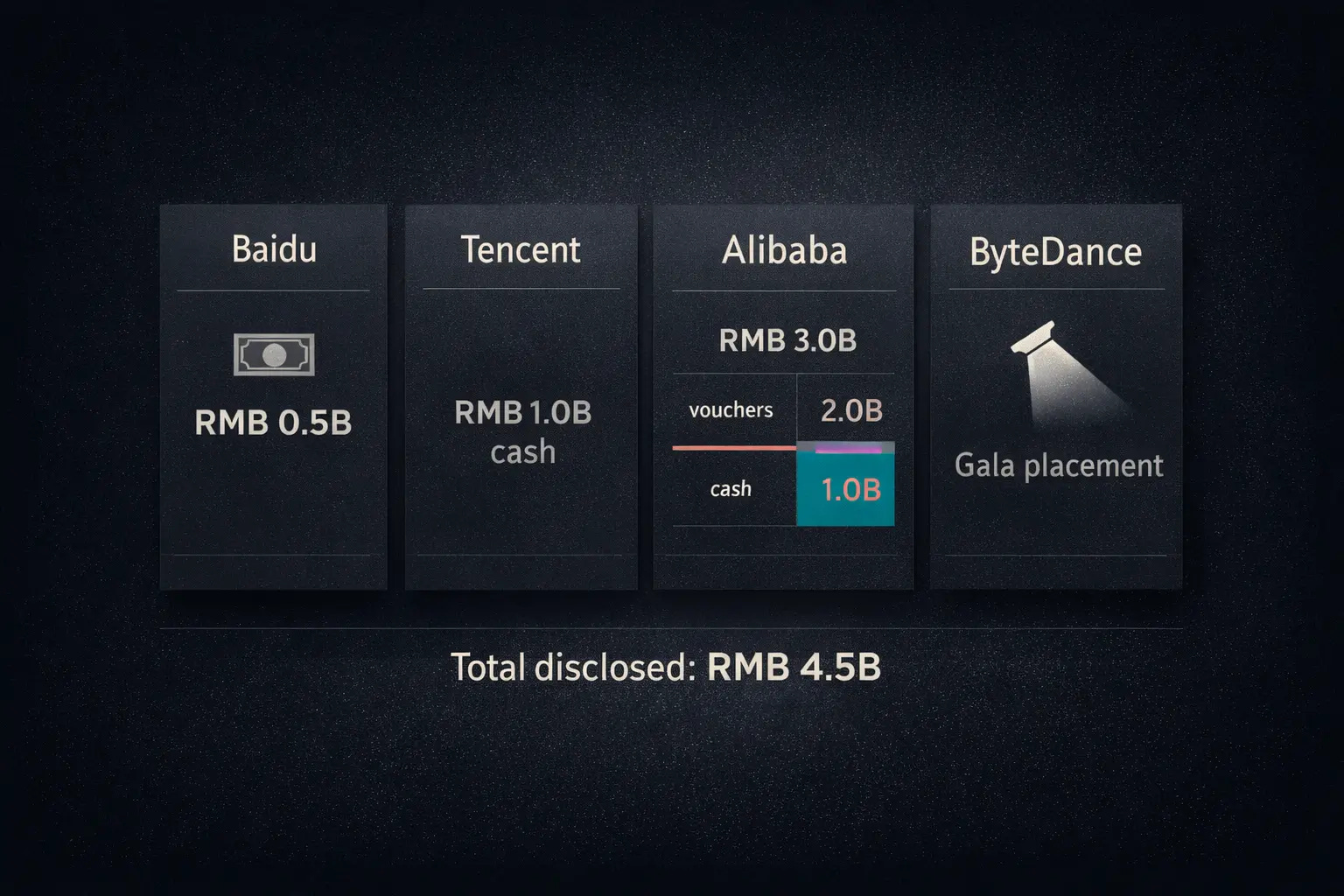 The Spring Festival AI war of 2026 drew four companies into direct subsidy competition. Baidu committed RMB 500 million, Tencent’s Yuanbao RMB 1 billion, and Alibaba’s Qwen RMB 3 billion, split between free-order vouchers and cash. ByteDance’s Doubao, as the exclusive AI cloud partner for the CCTV Spring Festival Gala, distributed tech products powered by its model alongside cash red packets but disclosed no total figure. The three announced campaigns alone reached RMB 4.5 billion, roughly $600 million.