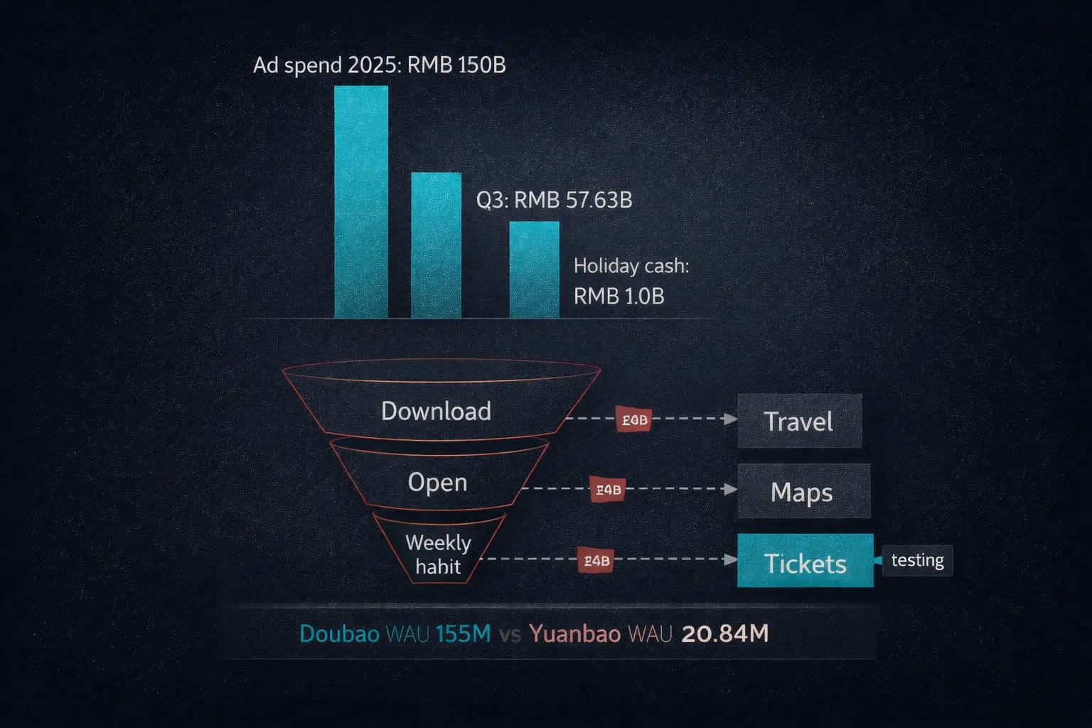 The question the spending leaves unanswered is where the funnel from download to daily usage breaks. By December 2025, Yuanbao’s weekly active users stood at 20.84 million, while Doubao held 155 million weekly actives at roughly one-third of Yuanbao’s per-user acquisition cost. The 7.4x gap is visible in every dataset. The cause is not. Does the funnel break at activation, when users open the app once for the red packet and never return? At early retention, when users try AI features but find no reason to come back? Or at core scenario absence, when the product lacks a use case sticky enough to compete with existing habits?