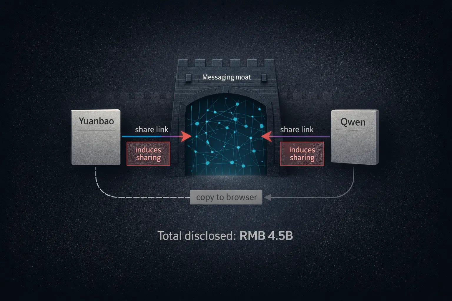 WeChat blocking its own sibling product was the moat paradox surfacing under pressure: when a platform operates as a country’s default communication infrastructure, the governance rules that sustain user trust cannot be suspended for anyone. Within days, WeChat applied the same restriction to Alibaba’s Qwen viral links. The platform was drawing a boundary that now sits across the entire category of AI-driven growth tactics.