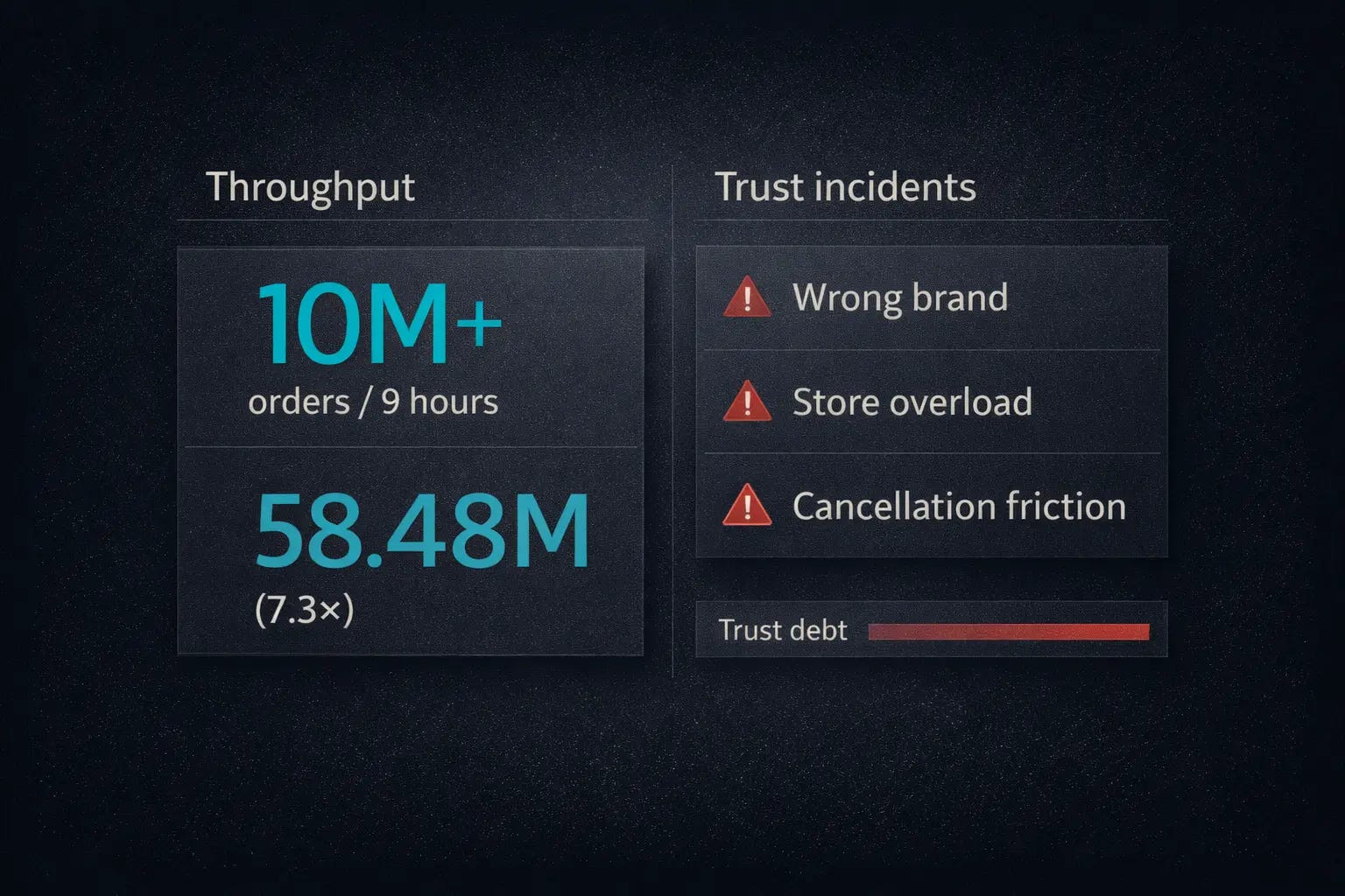The Spring Festival campaign forced that thesis into contact with millions of simultaneous users. On February 6, Qwen launched its “3 billion free order” promotion: speak a sentence, receive a milk tea, placed and paid through Qwen’s interface at near-zero cost. Within nine hours, the system had processed over 10 million orders. According to QuestMobile, Qwen’s daily active users reached 58.48 million, a 7.3x increase from baseline, closing the gap with Doubao to 22.75 million.