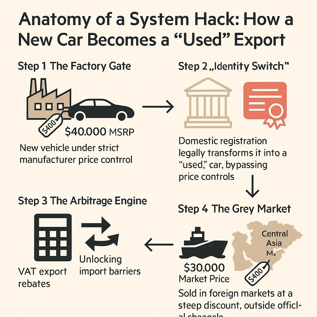 First comes the Domestic Legal Hack. In China, automakers exercise tight control over new car pricing through their official dealership networks to protect brand value and margins. This is a rigid, high-friction system. However, the moment a new car is registered with a domestic license plate—even for a single day—its legal identity transforms. It ceases to be a “new vehicle” and becomes a “used vehicle.” This simple, legal act serves as a key, instantly unlocking the car from the manufacturer’s price-controlled world and moving it into the far more flexible and unregulated open market for second-hand goods. The inventory is now liquid.