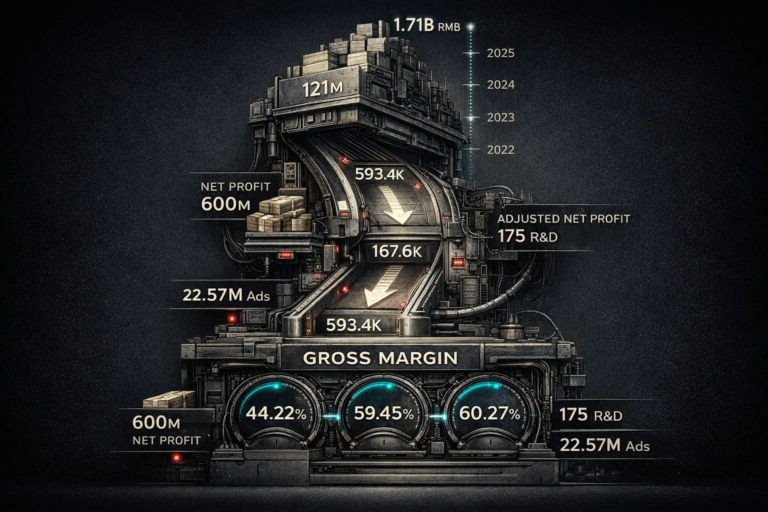 Revenue grew from RMB 121 million in 2022 to RMB 1.71 billion in 2025. The company turned profitable in 2024, with net income of RMB 94.5 million, then expanded that to RMB 288 million in 2025 on a GAAP basis. The difference between GAAP net income and the RMB 600 million adjusted figure stems from a one-time share-based compensation charge of RMB 349 million tied to an employee equity incentive program. The charge involves no cash outflow.