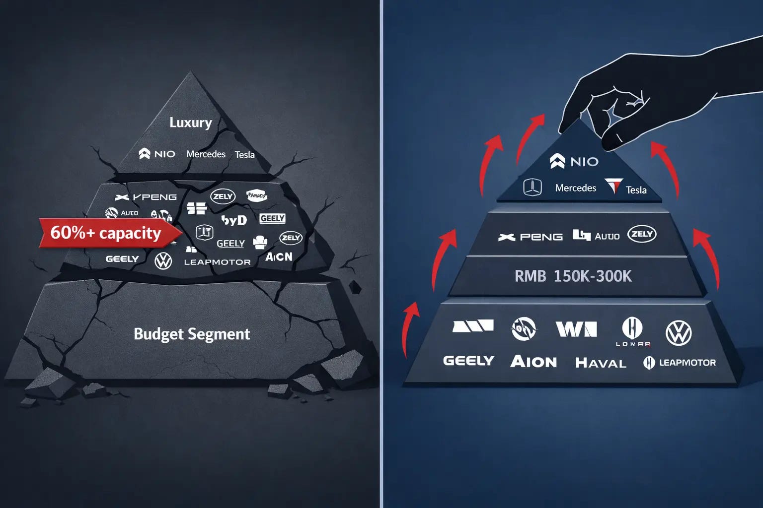 This pattern appears across categories: Chinese buyers skip “good enough” tiers and concentrate in premium segments, intensifying competition at the top. The price war reflects this structural reality: too many players competing in too few viable tiers. When 60%+ of production capacity targets the RMB 150,000–300,000 “mass premium” segment, small demand shocks trigger cascading discounts across the entire tier.