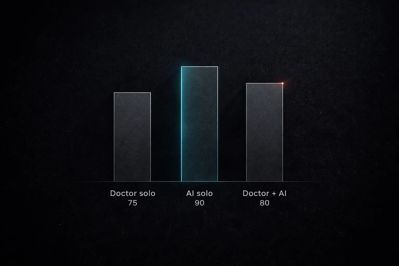 Physicians diagnosing alone: 75 percent accuracy. AI diagnosing alone: 90 percent. Physicians using AI as an aid: 80 percent.